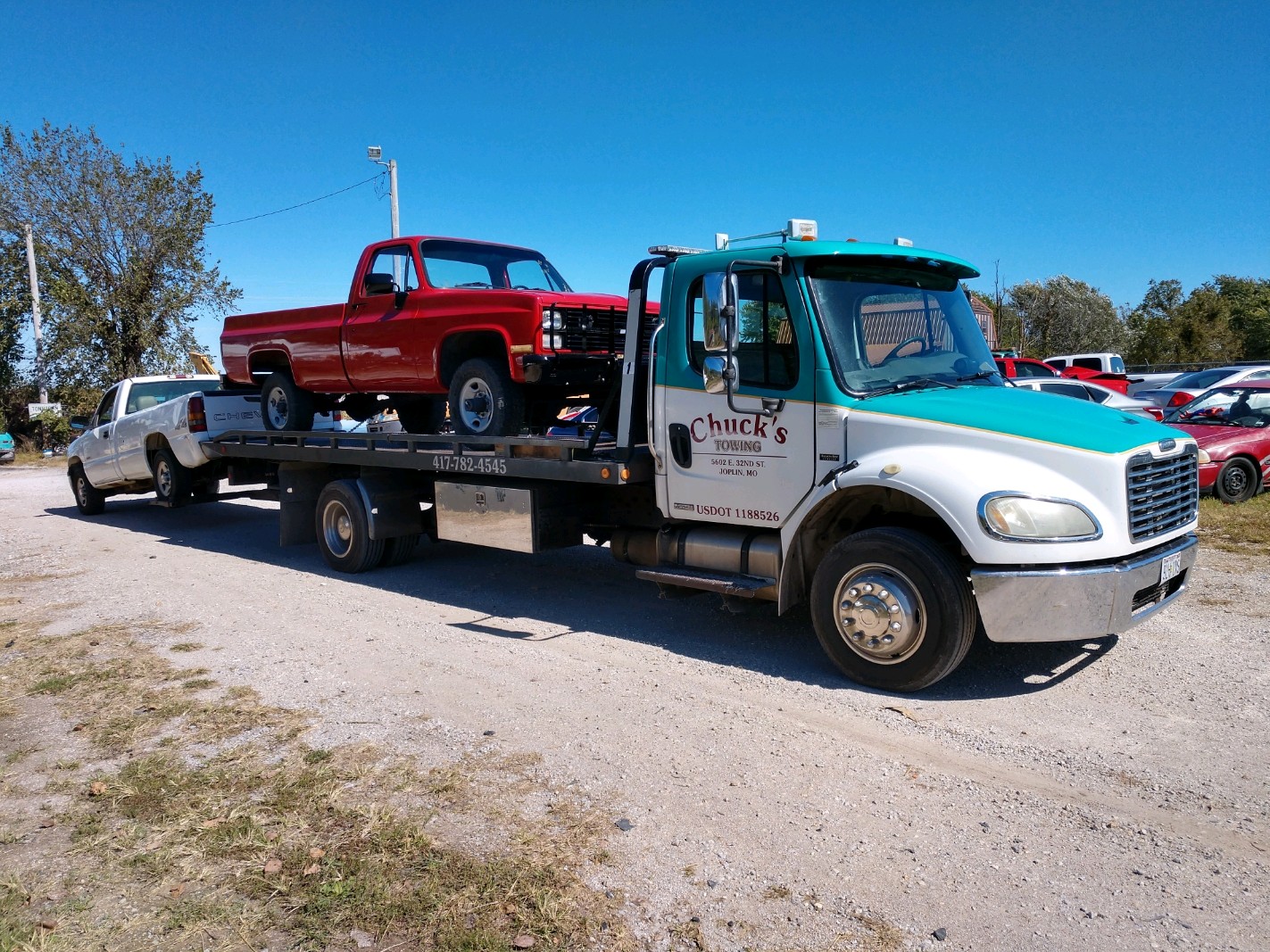Chuck’s Towing established in 1992 has a long tradition of providing fast quality service in the Joplin metro area. Conveniently located along I-44 and Highway 49 in Joplin Our helpful professionals can be anywhere in Joplin with a rollback or wrecker in minutes. Next time you say “I need a tow truck” remember the “Good Guys !“ If you’re stuck.. Call Chuck’s!